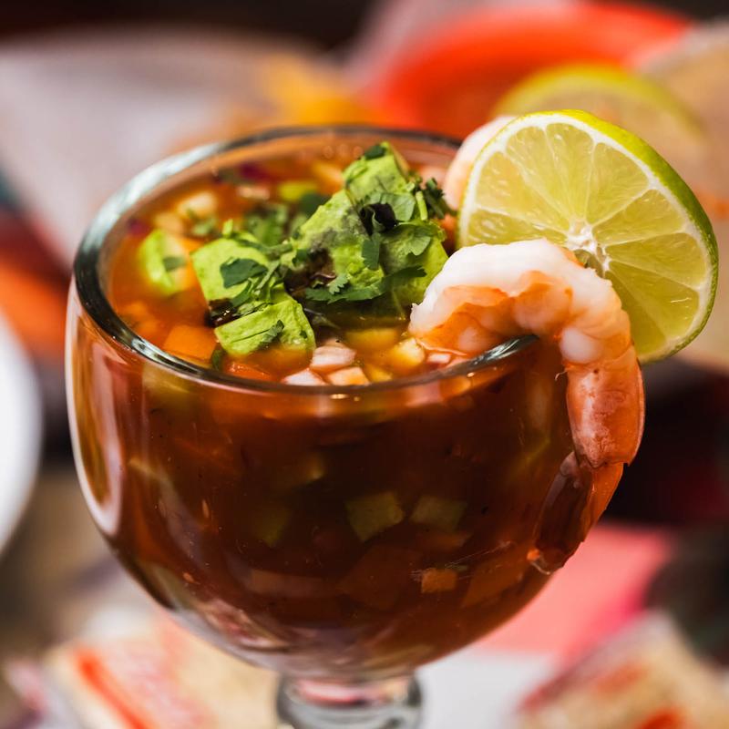Mexican shrimp cocktail with tomato, onion, cucumber, avocado, and cilantro in a homemade tomato sauce.
