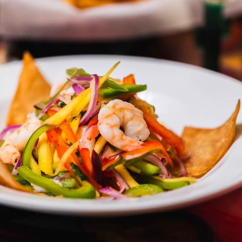 Flavorful lime-cooked shrimp with mango, peppers, onions, and cilantro.